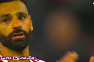 萨拉赫站在场内,对着球迷们长时间鼓掌,镜头给到他已经满脸泪水。