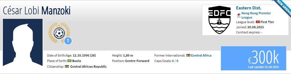 德转更新,前大连人外援曼佐基自由身加盟港超升班马东区。